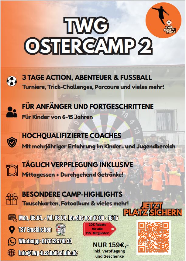 Du hast Lust auf 3 Tage Action und Fußball soviel Du willst? Dann bist Du beim Ostercamp der TWG-Fußballschule in Kooperation mit dem TSV genau richtig! Egal ob Du an das erste Mal kickst oder schon coole Tricks drauf hast, hier kannst Du von den Trainern bestimmt noch das eine oder andere lernen. Nebem dem Fußball gibt es auch ein spannendes Rahmenprogramm, langweilig wird es hier bestimt nicht.    Auch für die Verpflegung ist natürlich bestens gesorgt. Melde Dich einfach über den QR-Code an und sei dabei! Mitglieder beim TSV erhalten 10€ Rabatt auf die Anmeldegebühren.